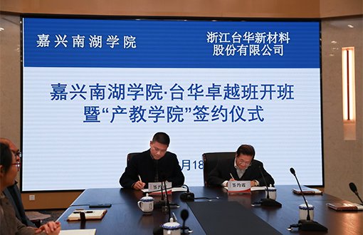 会上,双方正式签订嘉兴南湖学院-台华产教学院协议,根据合作协议,双方将通过共同制定人才培养计划、推进校内校外“双导师制”、共建实验室和科研基地等途径,持续完善多主体协同育人的长效机制。