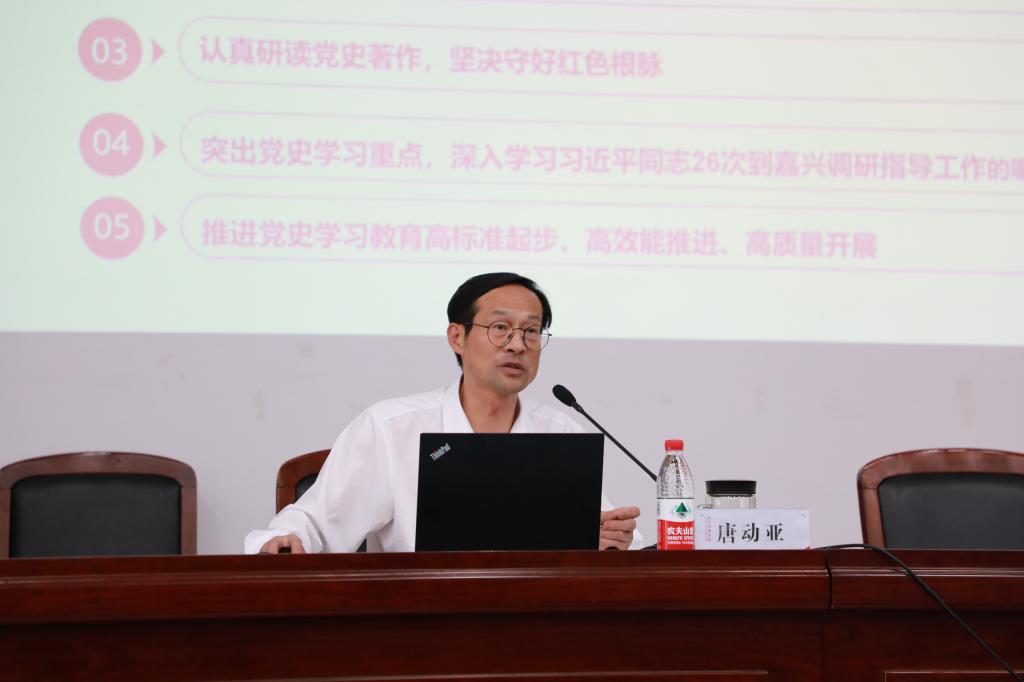 6月10日,嘉兴市党史学习教育市委宣讲团成员、市社科联副主席唐动亚受邀来校作“我是红船护旗手”党史学习教育宣讲报告。党委宣传部副部长杨燕群主持报告会。