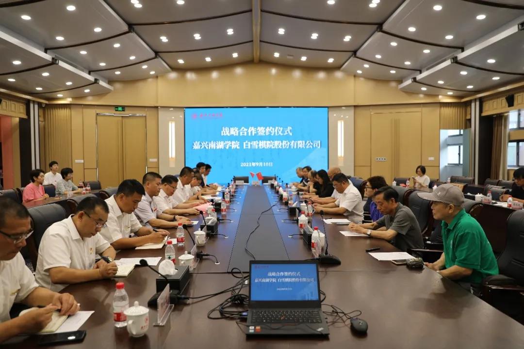 9月10日上午,嘉兴南湖学院与白雪棋院股份有限公司战略合作签约仪式在我校举行。嘉兴市政协副主席、校党委书记、嘉兴市经济技术开发区管委会主任盛付祥,浙江省智力运动管理中心主任毛昭平出席并致辞。副校长陈加明与白雪棋院董事长白洪闽代表合作双方签约。签约仪式由副校长袁志明主持。