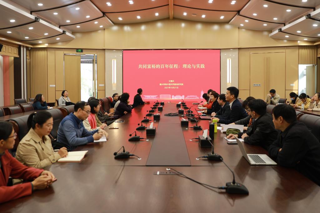 文雁兵作题为“共同富裕的百年征程:理论与实践”的宣讲,深刻阐释了共同富裕的价值与意义、共同富裕的中外历史维度的剖析、如何科学看待共同富裕及其实现以及共同富裕先行示范的背景等内容。他表示,共同富裕具有鲜明的时代特征和中国特色,是全面建成小康社会后的高级社会形态,是全体人民通过辛勤劳动和相互帮助,普遍达到生活富裕富足、精神自信自强、环境宜居宜业、社会和谐和睦、公共服务普及普惠,实现人的全面发展和社会全面进步,共享改革发展成果和幸福美好生活。浙江高质量发展建设共同富裕示范区,有利于通过实践进一步丰富共同富裕思想内涵,有利于探索破解新时代社会主要矛盾的有效途径,有利于为全国推动共同富裕提供省域范例,有利于打造新时代全面展示中国特色社会主义制度优越性的重要窗口。