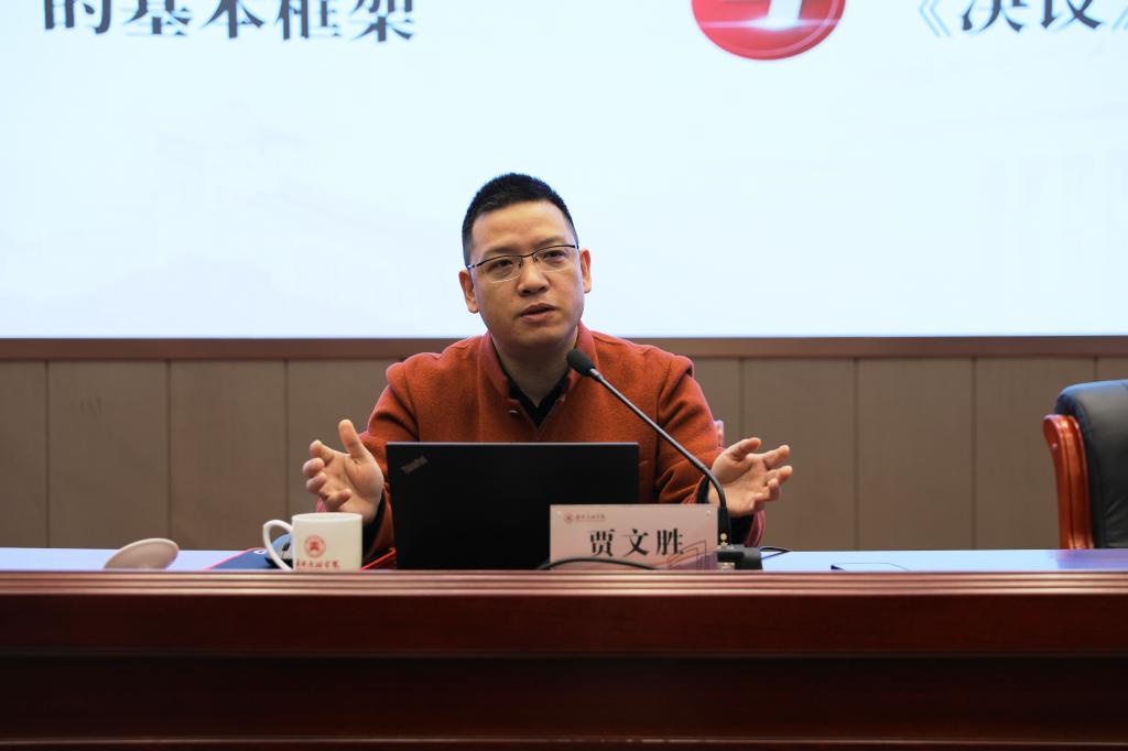 校党委副书记、校长贾文胜在商贸管理学院开展主题宣讲时对党的历史上三个《决议》的承续关系,《中共中央关于党的百年奋斗重大成就和历史经验的决议》的内在逻辑、基本框架、主要内容进行了深刻解读。他指出,《决议》总结好党走过的光辉历程,总结好党团结带领人民取得的辉煌成就,总结好党推进革命、建设、改革的宝贵经验,总结好党的十八大以来党和国家事业砥砺奋进的理论和实践。他要求全体同志要认真贯彻落实全会精神,从党的百年奋斗经验中汲取力量,以史为鉴、开创未来,埋头苦干,将党的十九届六中全会精神转化为推动学校高质量发展的强劲动力。