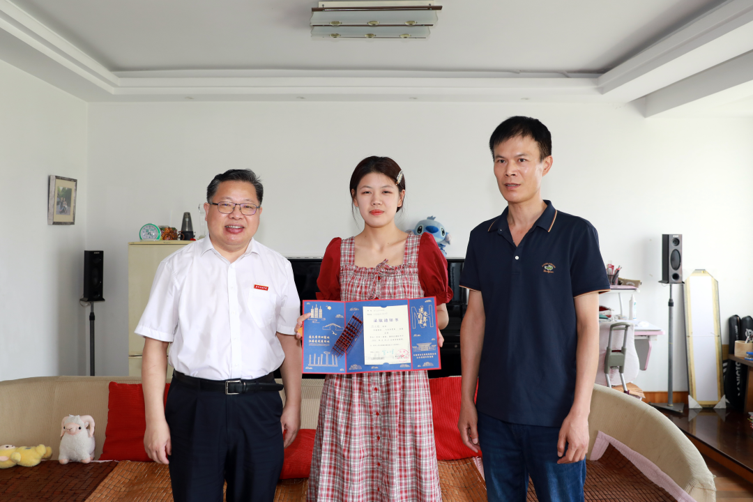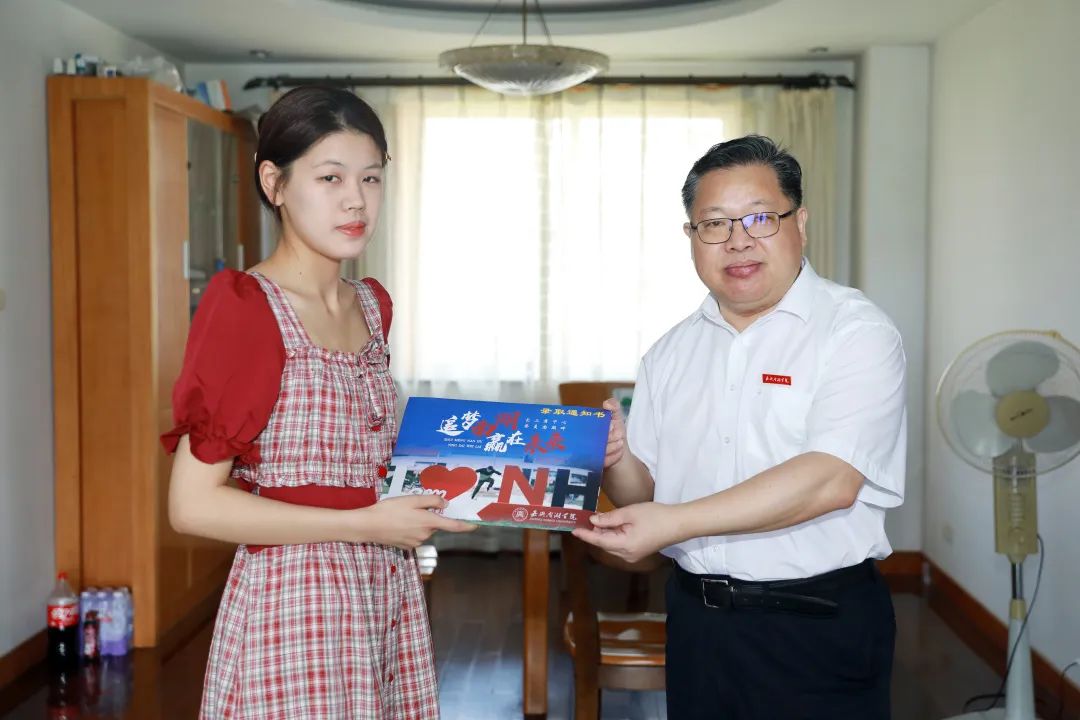 7月26日,嘉兴市政协副主席、校党委书记盛付祥为今年学校在嘉兴市录取的新生陈同学亲手送出录取通知书,并代表学校向陈同学及其家人表示祝贺。