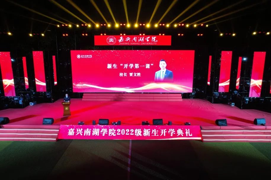 校长贾文胜在典礼上对新生们的到来表示了热烈的欢迎,并以“赓续红色血脉 领悟成长秘诀 在青春赛道上跑出当代青年的最好成绩”为题,给2496名新同学上了一堂特别的“开学第一课”。他以“伟大、诗意、活力”三个词介绍了嘉兴,从“特殊的校名、特殊的成立时点、特殊的发展使命”三个维度介绍了嘉兴南湖学院,勉励大家明白“有为才有位”的道理,追求“红专并举,知行双修”的美好品质,树立正确的人生观、职业观和学业观,践行“认真做事、老实做人、勤学苦练、乐于奉献”四句格言,锤炼意志、信心和品格,收获知识、健康与快乐。