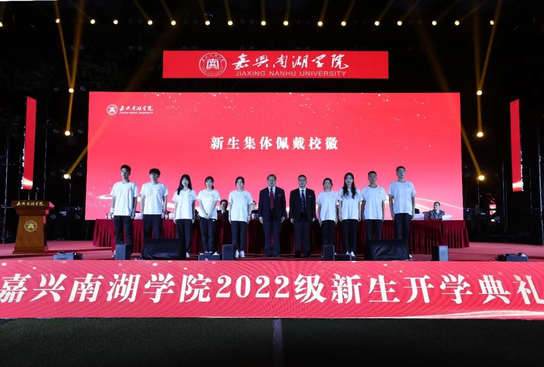 典礼在庄严的国歌声中拉开帷幕。嘉兴市政协副主席、校党委书记盛付祥为新生代表授予嘉兴南湖学院校徽,全体新生集体佩戴校徽,并在老师的见证下作了庄严宣誓,立志做革命红船的坚强守护者,为振兴中华、造福人类而奋斗终身。