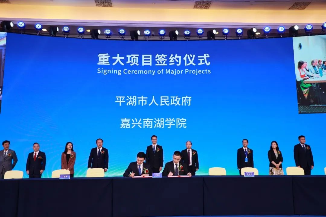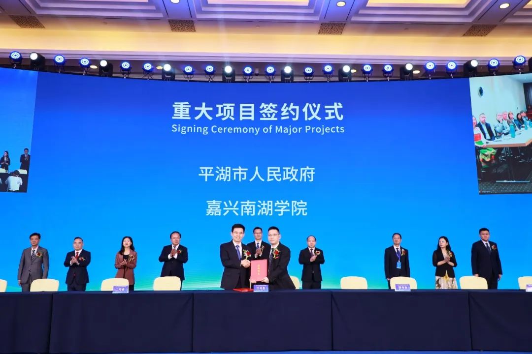 开幕式上,贾文胜代表学校与平湖市委副书记、市长周军波签订校地战略合作协议。根据协议内容,未来双方将在红色党建、共建嘉兴南湖学院平湖研究院、高层次人才共引共享、人才培养、乡村振兴等领域,结合学校优势学科和平湖市重点产业,聚焦先进装备制造、新材料、时尚设计等方面开展深入合作。