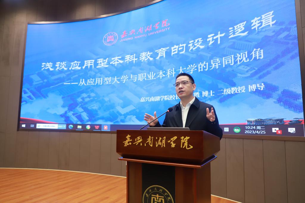 校长贾文胜从关于大学的内涵界定、关于应用型(职业)本科的内涵界定、应用型本科教育的设计逻辑三方面作题为“浅谈应用型本科教育的设计逻辑——从应用型大学与职业本科大学的异同视角”的报告。他表示从社会需求出发,颠覆因循守旧的育人模式,是应用型大学发展的唯一出路,嘉兴南湖学院要紧紧抓住“唯一红船起航地”“唯一战略腹地中心”“唯一市属应用型大学”三个“唯一”,向着“不可或缺”的目标重新出发,是实现创新发展的不二选择。