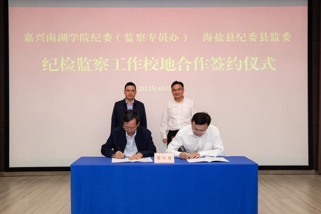 10月13日下午,嘉兴南湖学院纪委(监察专员办)与海盐县纪委县监委签订纪检监察工作校地合作协议。嘉兴南湖学院党委副书记、校长贾文胜,党委委员、纪委书记、省监委驻嘉兴南湖学院监察专员蒋文波,海盐县委副书记、统战部部长张华良,县委常委、纪委书记、县监委主任范剑春出席签约仪式。