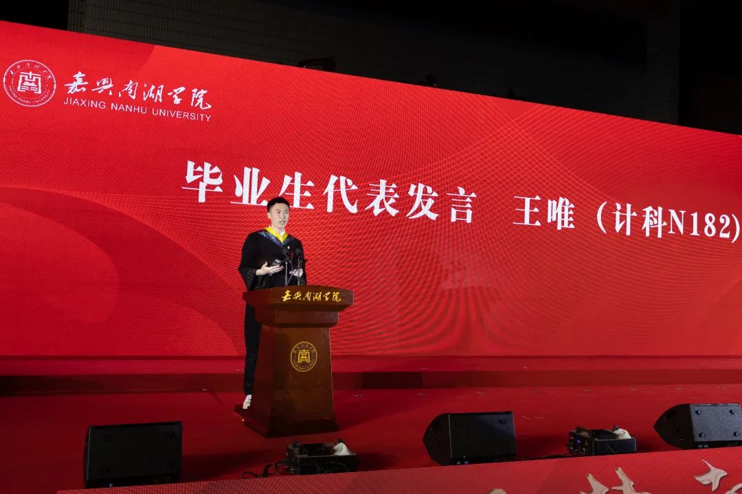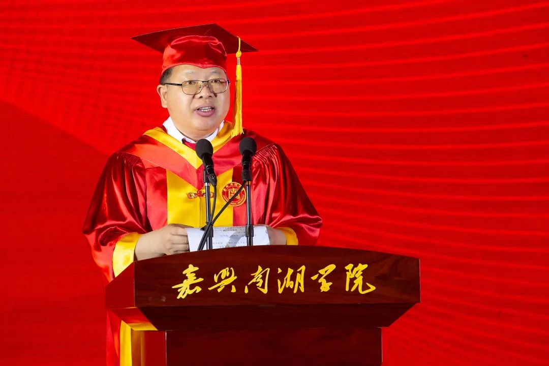 嘉兴市政协副主席、校党委书记盛付祥代表学校向圆满完成学业的1898名毕业生表示衷心祝贺。他深情地说道:“一代人有一代人的际遇,一代人有一代人的奋斗,一代人有一代人的青春。山水一程,三生有幸。感谢同学们四年来奋力拼搏、屡创佳绩,把最美好的青春镌刻进嘉兴南湖学院的创业篇章!长空万里,好风正劲。祝愿同学们在未来勇毅前行、生如夏花,把最理想的成绩融汇进嘉兴南湖学院的奋进历史!”