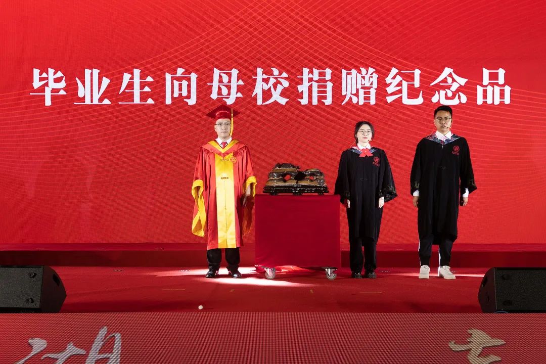 校长贾文胜代表学校接受2022届毕业生代表捐赠的纪念品“融会贯通石”,并寄语全体毕业生时来运转启新程,石破天惊闯事业,实事求是做好人,十全十美享人生。