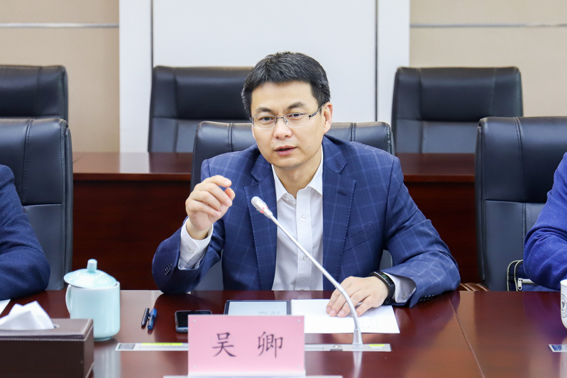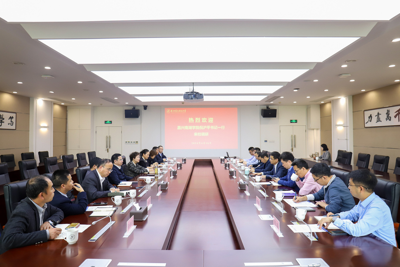 吴卿首先对倪沪平一行的到来表示欢迎。他表示,嘉兴南湖学院是一所特色鲜明的高校,两校在学科领域和办学特色上有很强的专业亲缘性和很大的合作潜力。他强调,积极进行科教融汇、产教融合不仅是响应国家教育科技人才一体化发展的政策要求,更是推动学校高质量发展的关键所在,加强交流合作有助于双方共同提升办学水平和社会影响力。