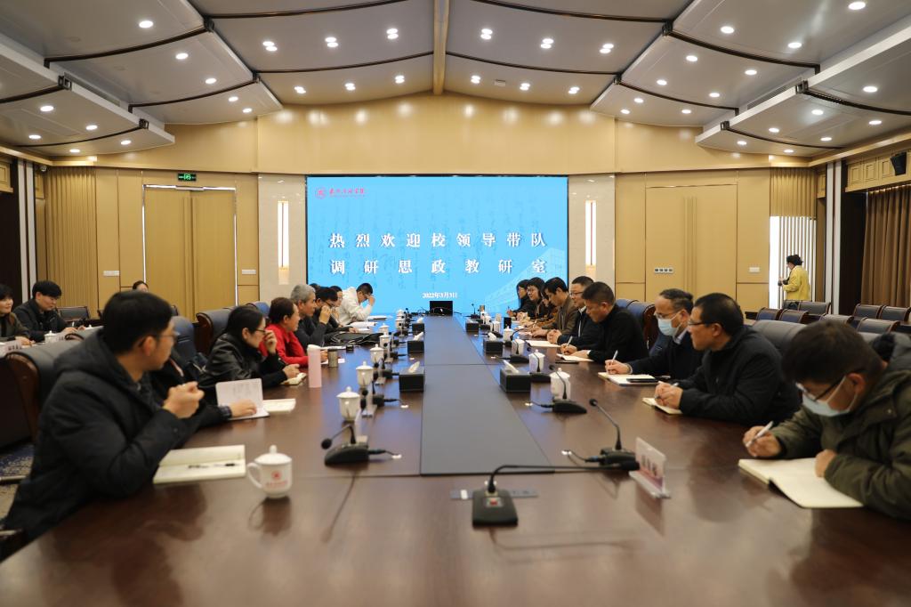 3月3日下午,校党委副书记胡文蔚、副校长陈加明一行赴思政教研室调研,深入了解我校思政课程教学情况,加快推进马克思主义学院建设。学校相关职能部门负责人、人文与艺术学院负责人及全体思政教师参加会议。